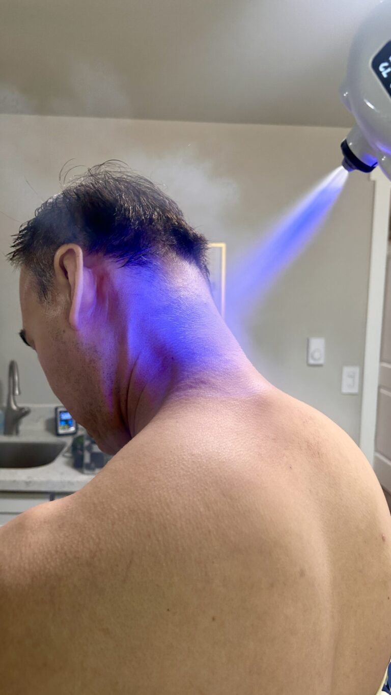 Our Pain & Inflammation Spray delivers fast, targeted relief using localized cryotherapy—one of the most effective natural tools for calming irritated tissues. By applying precise, penetrating cold to the affected area, the treatment instantly reduces surface temperature and signals the body to slow inflammation. Clients feel a noticeable decrease in tension, pressure, and discomfort within seconds of application.